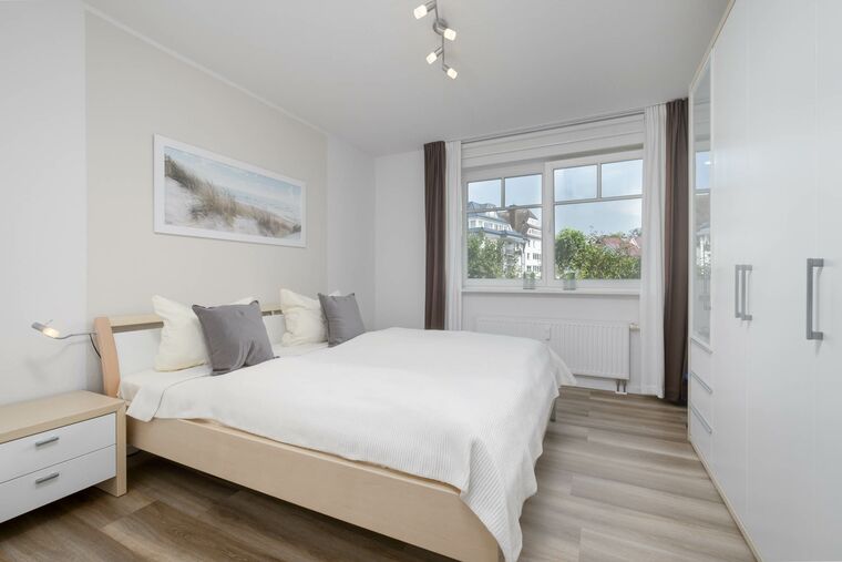 Das separate Schlafzimmer dieser Niendorf Ferienwohnung ist mit einem Boxspring (180 x 200cm) und einem großzügigen Kleiderschrank am Fußende des Bettes eingerichtet. Ein möblierter Balkon in Süd-Ost-Ausrichtung lädt zum Entspannen ein.