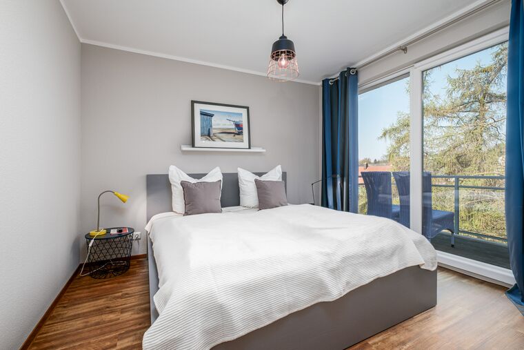 Das Elternschlafzimmer dieser Ferienwohnung Timmendorfer Strand ist mit einem Doppelbett (180 x 200 cm) ausgestattet, das zweite Schlafzimmer mit 2 Etagenbetten. Das Elternschlafzimmer verfügt über einen eigenen Balkonzugang in Süd-/Ostlage. Eines der Schlafzimmer verfügt zudem über einen zusätzlichen Flatscreen-TV: