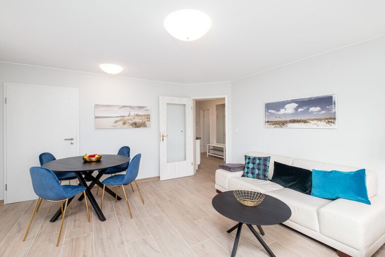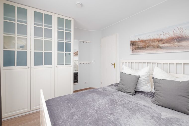 Zudem verfügt die Timmendorfer Strand Ferienwohnung über 2 separate Schlafzimmer (1x Doppelbett, 1x Etagenbett). Das hell geflieste Badezimmer verfügt über eine Dusche und ein WC.