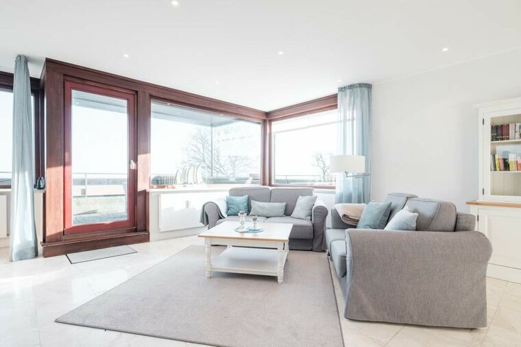 Das Wohnzimmer verfügt über einen gemütlichen Couchbereich mit Kamin, zwei Sesseln und einem Flatscreen-TV. Von der Essecke aus bietet sich Ihnen ein unvergleichlicher Ausblick auf die Ostsee.