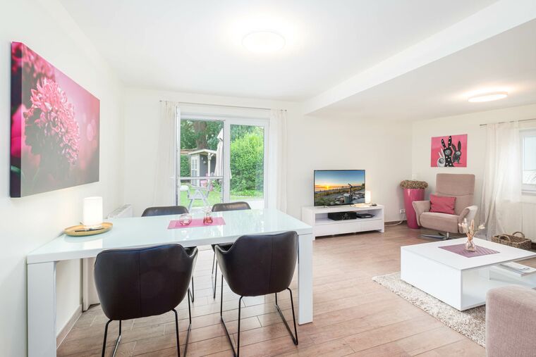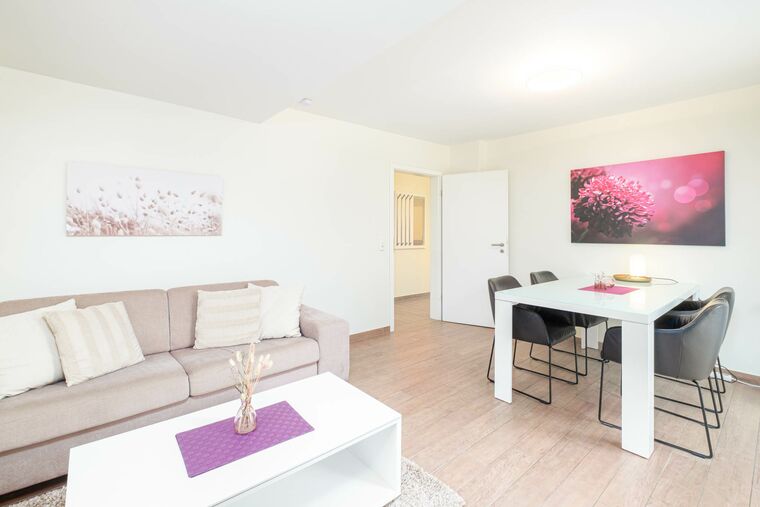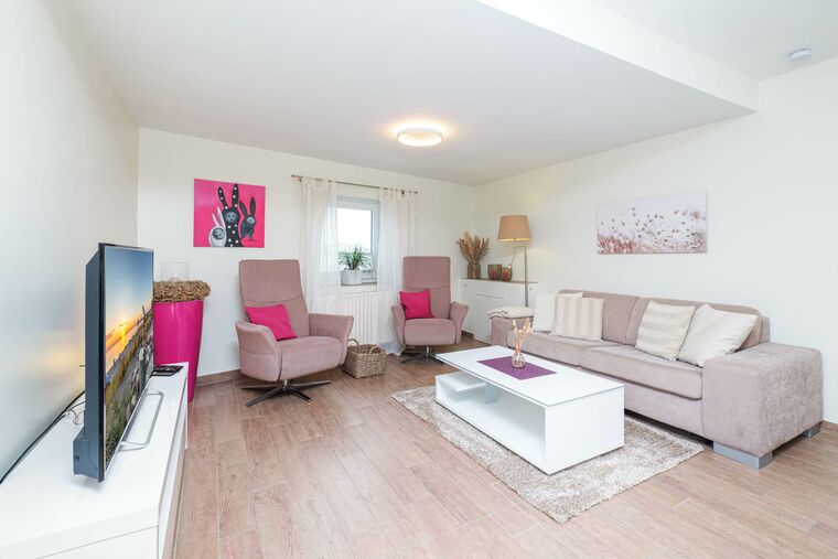 Das Wohnzimmer ist mit einer modernen Couchgarnitur und einer schönen Essecke ausgestattet. Es verfügt über einen Flatscreen TV, Blu-Ray-Player und Radio/CD-Musikanlage. Die beiden separaten Schlafzimmer sind jeweils mit Boxspring-Doppelbetten (beide mit durchgängigem Topper, 180x200cm) und Flatscreen TV eingerichtet. Um Ihnen einen erholsamen Schlaf zu garantieren, lassen sich die Schlafräume der Ferienwohnung verdunkeln. Die separate Küche ist mit Ceranfeld, Backofen, Mikrowelle und Geschirrspüler, sowie einer Essecke ausgestattet. Das Badezimmer verfügt über eine Badewanne und eine Dusche, sowie eine Waschmaschine und Fußbodenheizung.