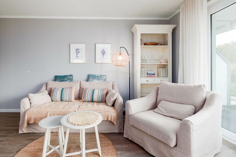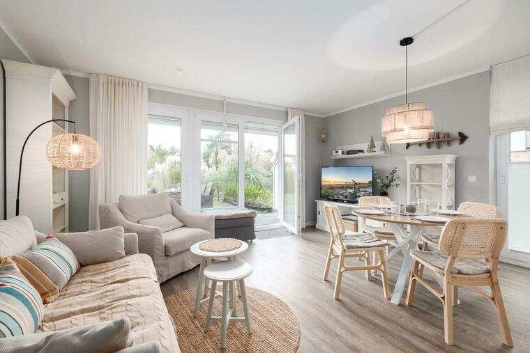Das moderne 3-Zimmer-Appartement ist für 5 Personen geeignet. Die Ferienwohnung Scharbeutz befindet sich im Erdgeschoss mit möblierter Terrasse in Süd-West-Richtung mit Markise. Das Wohnzimmer ist mit einer Couchgarnitur, Flatscreen-TV, Stereo-Anlage und einer gemütlichen Essecke ausgestattet. Die offene Einbauküche schließt sich an die Essecke an und verfügt über Ceranfeld, Backofen, Mikrowelle, Nespresso Maschine und Geschirrspüler.