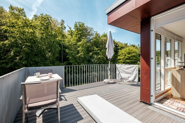 Die umlaufende Dachterrasse mit Sitzbereich und dem seitlichen Meerblick rundet dieses wunderschöne Urlaubsdomizil in Timmendorfer Strand an der Ostsee ab.