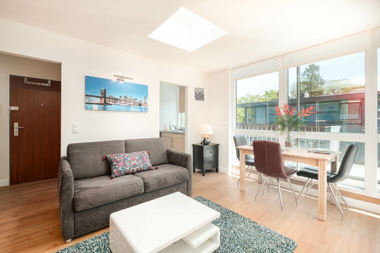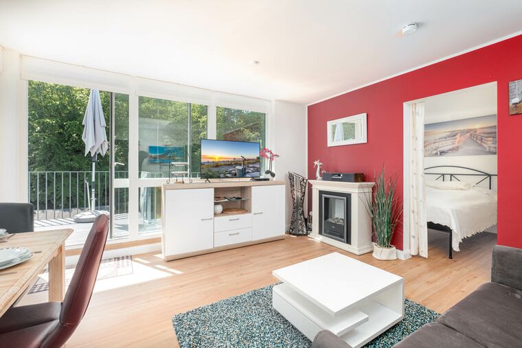 In der 3. Etage erwartet Sie dieses traumhafte Penthouse Traumsonne für 3 Personen mit Dachterrasse und seitlichem Meerblick. Die Timmendorfer Strand Ferienwohnung ist sehr modern und liebevoll ausgestattet. Das Wohnzimmer ist mit einer bequemen und komfortablen Schlafcouch, Flatscreen-TV, Stereo-Anlage, Elektro-Kamin und einem großzügigen Essbereich eingerichtet. Die angrenzende Küche verfügt über Ceranfeld, Backofen und Wasserkocher - einen Geschirrspüler gibt es nicht.