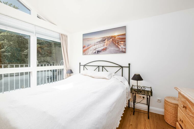Das Schlafzimmer verfügt über ein großes Doppelbett (160x200cm) mit Allergiker Matratzen. Zwischen Wohn- und Schlafzimmer befindet sich nur ein Vorhang, keine Tür. Um Ihnen einen erholsamen Schlaf zu garantieren, lassen sich die Schlafräume der Ferienwohnung verdunkeln. Das Badezimmer erwartet Sie mit einem modernen Waschtisch und einer Dusche.