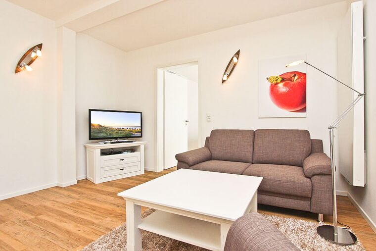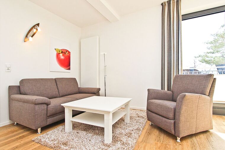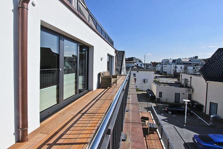 Hier erwartet Sie eine moderne Ferienwohnung Timmendorfer Strand für maximal 2 Personen in der 2. Etage mit einem großen Penthouse-Balkon in Süd-/Westlage. Das moderne Wohnzimmer verfügt über einen Couchbereich mit Flatscreen-TV und Blu-Ray-Player. Ebenfalls befinden sich in diesem Raum der großzügige Essbereich und die Küche. Diese verfügt über Geschirrspüler, Backofen, Cerankochfeld, Mikrowelle, Nespresso-Kaffeemaschine, Toaster und Wasserkocher. Das separate Schlafzimmer der Timmendorfer Strand Ferienwohnung ist mit einem Doppelbett (180x200cm) eingerichtet. Das große Badezimmer ist mit einer Dusche ausgestattet. Der große Penthouse-Balkon in Süd-/Westlage mit Markise rundet dieses wunderschöne Appartement im Zentrum von Timmendorfer Strand ab.