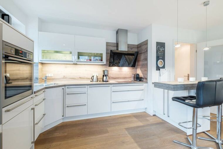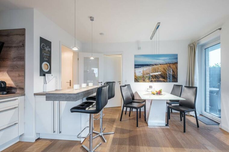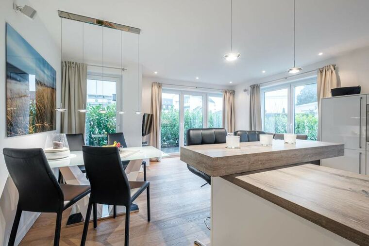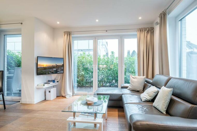 Dieses Appartement liegt barrierearm im Erdgeschoss mit Terrasse und ist für maximal 4 Personen ausgestattet. Diese Ferienwohnung Timmendorfer Strand verfügt über ein Wohnzimmer mit einer hochwertigen Leder-Couchgarnitur, Flachbild-TV, einem gemütlichen Esstisch und einer offenen Einbauküche mit Ceranfeld, Backofen, Gefrierschrank, Geschirrspüler und Nespresso Kapsel-Kaffeemaschine, ein modernes Duschbad und eine freundlich empfangende Diele.