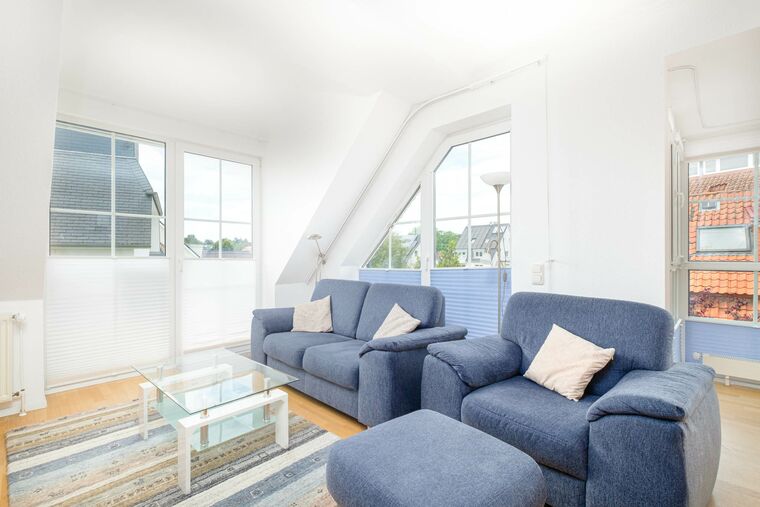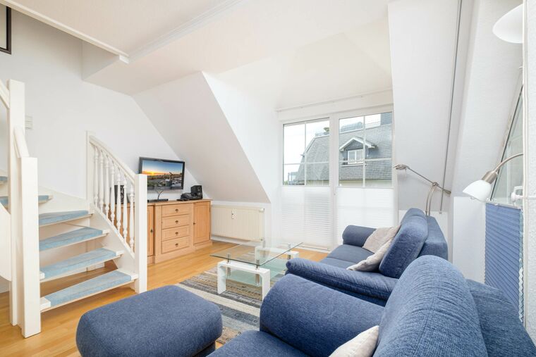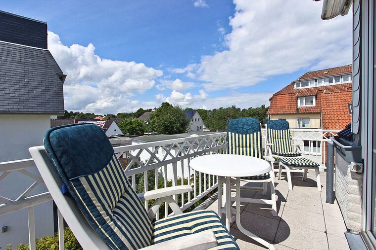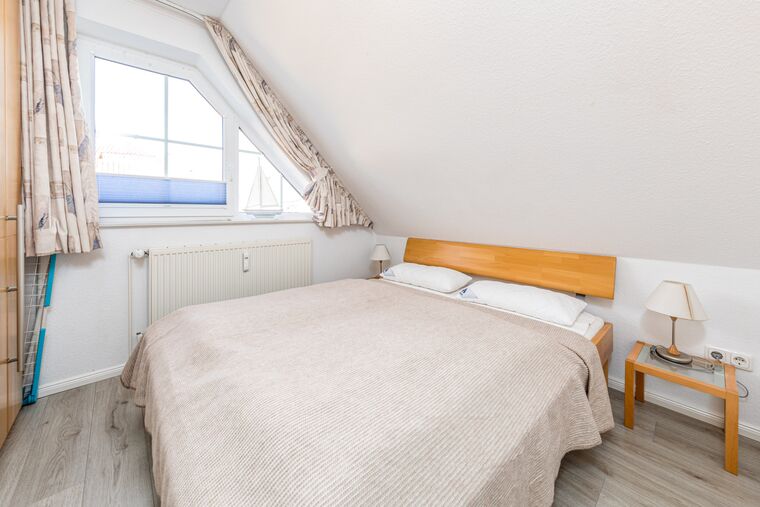 Das Schlafzimmer I ist mit einem Doppelbett (180x200 cm) und einem Kleiderschrank eingerichtet. Den zweiten Schlafbereich erreichen Sie über die Treppe aus dem Wohnraum - es gibt keine weitere Tür. Hier erwartet Sie ebenfalls ein Doppelbett (160x200 cm). Das Badezimmer ist mit einem Waschtisch sowie einer Dusche ausgestattet. Der möblierte Balkon in Süd-/Westlage mit Markise rundet diese moderne Ferienwohnung Timmendorfer Strand ab.