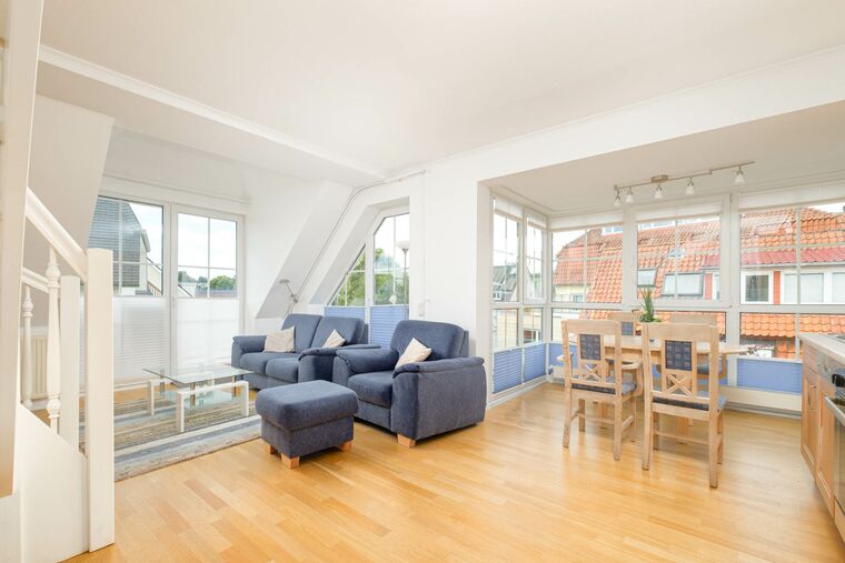 Hier erwartet Sie eine geschmackvoll und hochwertig eingerichtete Ferienwohnung für maximal 4 Personen in der 2. Etage mit Balkon in Süd-/Westlage. Das Wohnzimmer verfügt über einen gemütlichen Couchbereich mit Flatscreen-TV, Stereo-Anlage sowie den großen Essbereich im Erker und die komplett ausgestattete Küchenzeile mit Backofen, Mikrowelle, Cerankochfeld und Geschirrspüler.