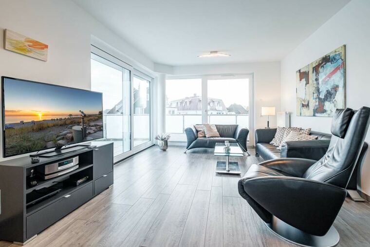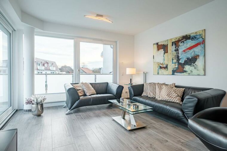 Es erwartet Sie ein modernes, liebevoll eingerichtetes Appartement in der 1. Etage für 3 Personen. Die Timmendorfer Strand Ferienwohnung verfügt über ein Wohnzimmer mit hochwertiger Couchgarnitur, Flatscreen-TV, Stereo-Anlage, DVD-Blue-Ray-Player, sowie einer offenen Einbauküche mit Ceranfeld, Backofen und Geschirrspüler. Darüber hinaus finden Sie eine Filter Kaffeemaschine und eine Senseo Maschine vor. Eine schöne Essecke, in der man Urlaubspläne schmieden kann, rundet dieses Zimmer ab.