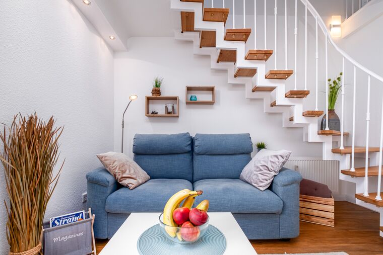 Die Ferienwohnung geht über 2 Ebenen. Im Erdgeschoss erwartet Sie das Wohnzimmer mit hochwertiger Couchgarnitur, großem Flatscreen-TV mit Kabelanschluss und gemütlichem Essbereich für vier Personen.