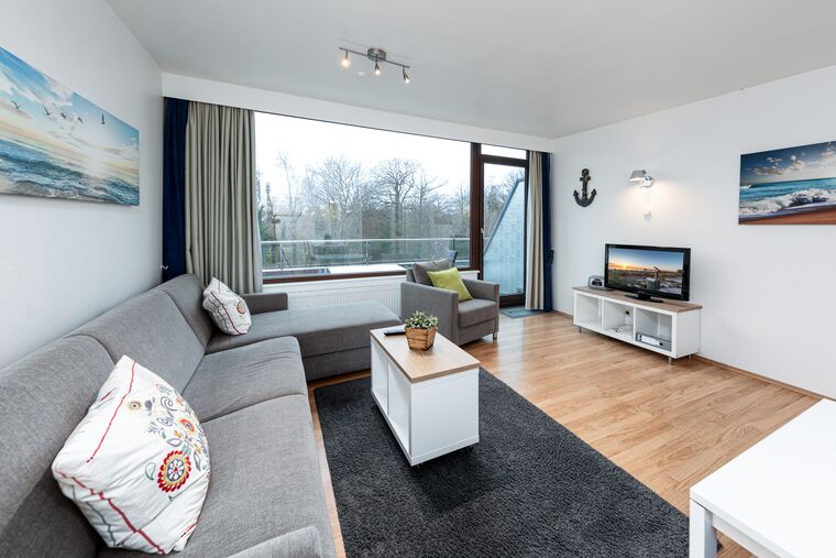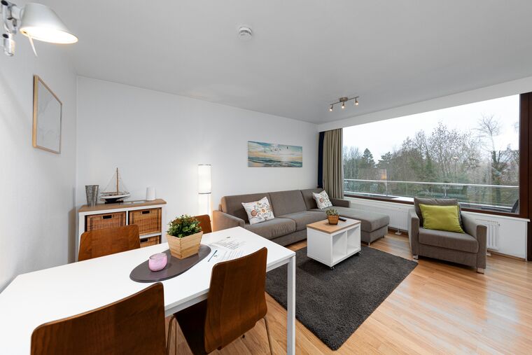 Es erwartet Sie das helle und freundliche 2-Zimmer-Appartement Nr. 28 auf der 3. Etage für bis zu 4 Personen. Der Wohn-Essbereich der Scharbeutz Ferienwohnung ist mit einer komfortablen Couchgarnitur mit Schlaffunktion (1,80m x 2,00m), einem Flatscreen-TV und einem gemütlichen Essbereich ausgestattet. Die offene Küchenzeile in der Diele verfügt unter anderem über ein Cerankochfeld, einen Backofen, eine Filterkaffeemaschine und einen Wasserkocher.