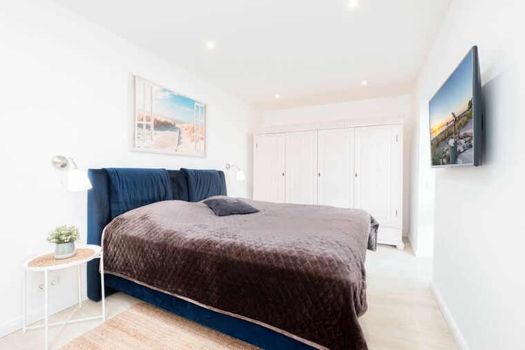 Das separate Schlafzimmer ist mit einem sehr komfortablen Box-Spring-Bett ausgestattet in dem es sich herrlich träumen und erholen lässt. Der zweite Flatscreen-TV sorgt für zusätzliche Entspannung, wenn man einmal getrennt TV schauen möchte. Ein großer Kleiderschrank bietet genügend Stauraum für Hosen, Pullis, Jacken und das weitere Reisegepäck.