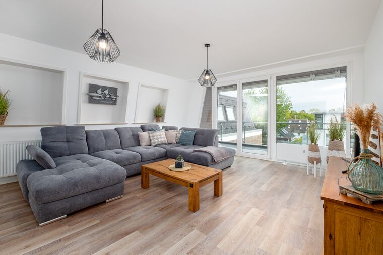 Die Ferienwohnung Ahoi begrüßt Sie auf der zweiten Etage auf 118qm mit einem großen Wohn- und Essbereich, einer separaten Küche, 2 separaten Schlafzimmern und 2 Badezimmern. Das Wohnzimmer ist mit einer großen Couchgarnitur mit Schlaffunktion (160x200cm), einem Flatscreen-TV und einem Blu-Ray-Player ausgestattet. Für die passende Urlaubsmusik stehen Ihnen in diesem Appartement 2 Sonos Boxen zur Verfügung. Der großzügige Essbereich lädt nicht nur zu tollen Mahlzeiten, die sich perfekt und ungestört in der separaten Küche - in welcher Ihnen neben einer Filterkaffeemaschine zudem eine Nespressomaschine zur Verfügung stehen - zubereiten lassen, sondern auch zu witzigen Spieleabenden ein.