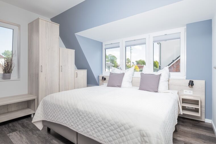 Weiterhin befinden sich auf dieser Etage die drei Schlafzimmer der Timmendorfer Strand Ferienunterkunft, die sich allesamt durch Außenjalousien abdunkeln lassen. Zwei Schlafzimmer sind jeweils mit einem hochwertigen Doppel-Boxspringbett und maßgefertigten Kleiderschränken ausgestattet. Das dritte Schlafzimmer bietet ein vollwertiges Einzel-Boxspringbett und ausreichen Ablagemöglichkeiten.