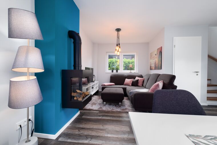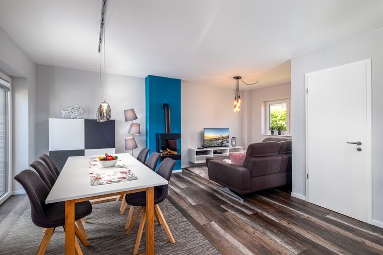 Im Erdgeschoss geht es von der Diele aus in den lichtdurchfluteten Wohnbereich. Hier erwartet Sie eine große komfortable Couchgarnitur, ein Samsung UHD-TV mit Soundbar, ein Gaskamin sowie eine offene Essgruppe. Zudem haben Sie hier über eine große Fensterfront Zugang auf die möblierte Terrasse.