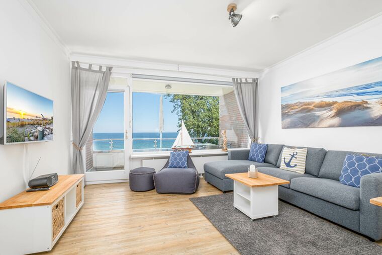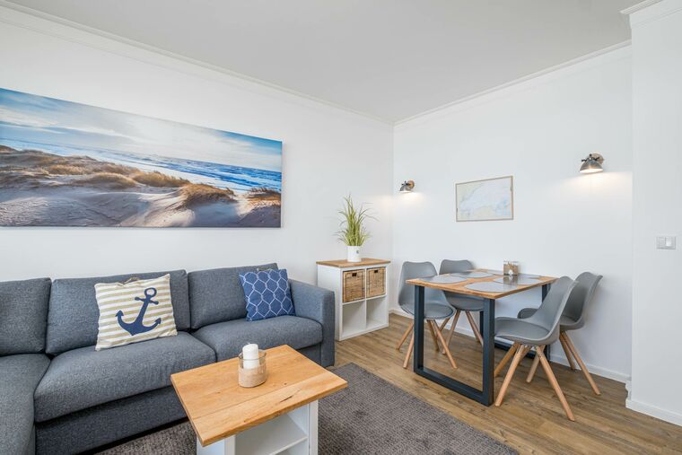 Es erwartet Sie das helle, einladende 2-Zimmer-Appartement Nr. 20 auf der 2. Etage für bis zu 4 Personen. Der Wohn-Essbereich der Scharbeutz Ferienwohnung ist mit einer komfortablen Couchgarnitur mit Schlaffunktion (1,40 x 2,00m), einem Flatscreen-TV und einem gemütlichen Essbereich ausgestattet.