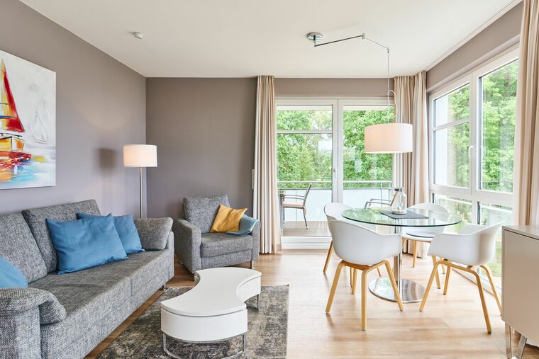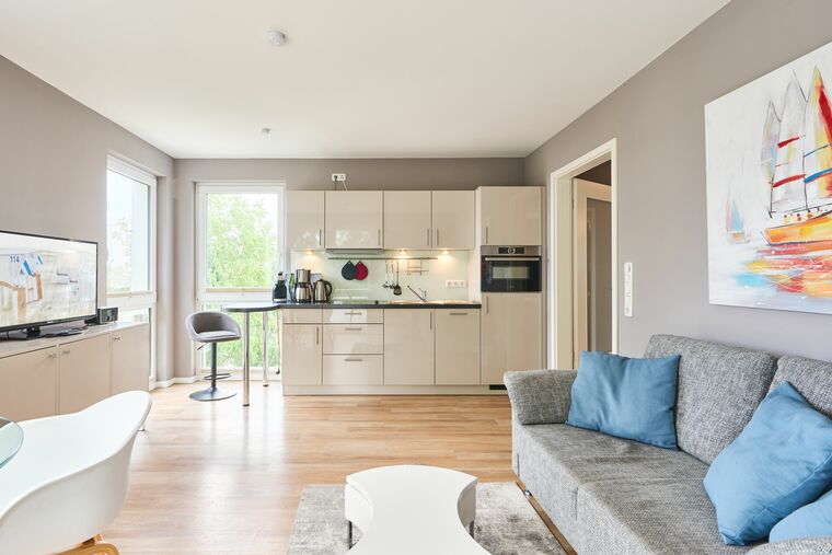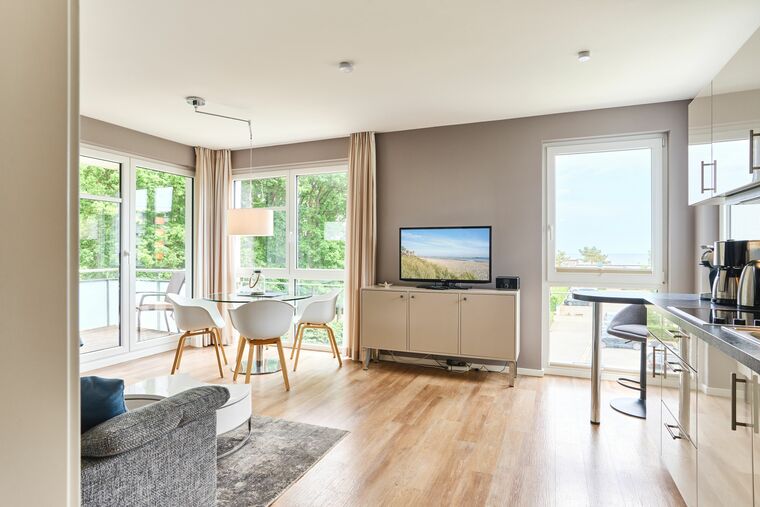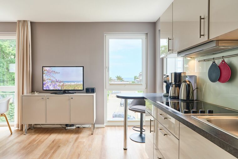 Diese geschmackvoll eingerichtete Ferienwohnung bietet Ihnen einen gemütlichen Wohn-Essbereich. Genießen Sie den Blick auf die Ostsee schon vom Esstisch aus. Die Couch lässt sich mit nur wenigen Handgriffen in eine bequeme Schlafcouch verwandeln. Neben dem Flachbildfernseher und dem 3D-BluRay-Player steht Ihnen ein CD-Player zur Verfügung. Kostenloses WLAN ist selbstverständlich. Der überdachte Balkon mit Blick auf die Ostsee ist mit Tisch und Stühlen ausgestattet. Die moderne Küche lässt keine Wünsche offen. Neben der Filterkaffeemaschine steht Ihnen hier noch zusätzlich eine Dolce-Gusto-Maschine zur Verfügung. Im Schlafzimmer stehen ein bequemes Doppelbett (1,80 x 2,00m) sowie ein geräumiger Schrank. Zusätzlich steht Ihnen auch hier ein Flachbildfernseher zur Verfügung. Auch vom Schlafzimmer haben Sie Zugang zum Balkon. Das Badezimmer verfügt über eine bodentiefe Dusche und einen großen Spiegel. Neben der Fußbodenheizung ist hier ein zusätzlicher Handtuchheizkörper angebracht. Die gesamte Wohnung verfügt über bodentiefe Fenster.