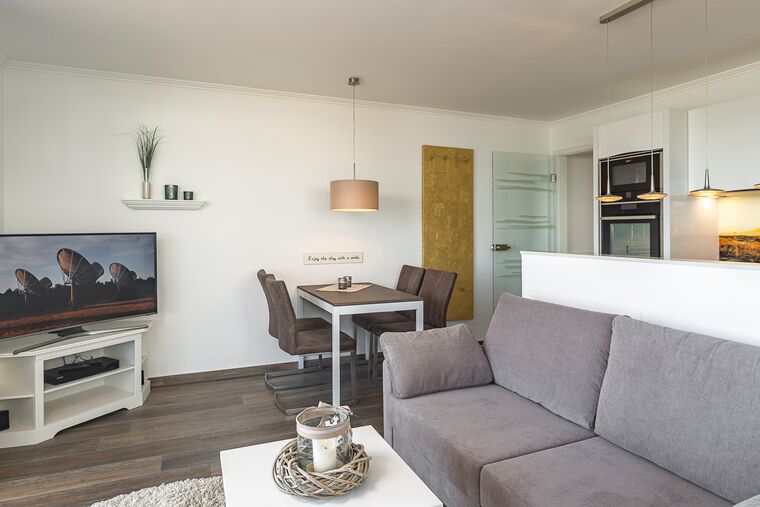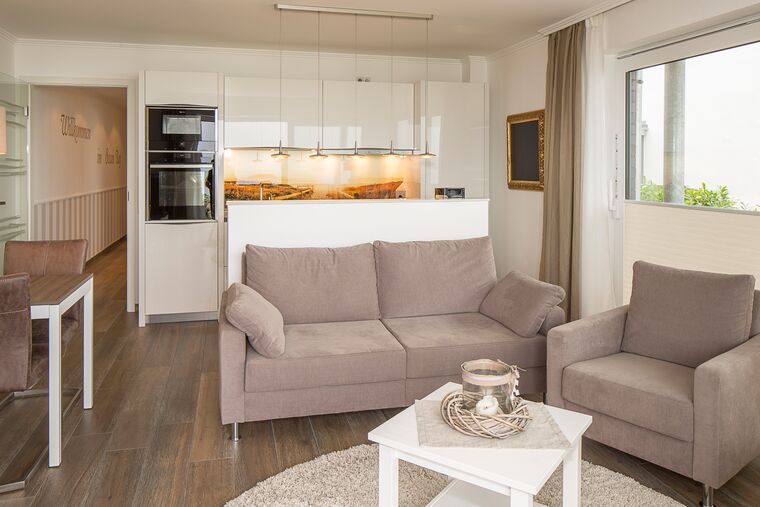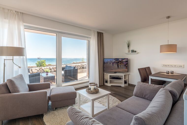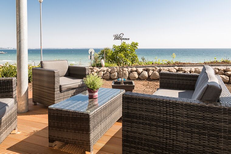 Weitere besondere Komfortmerkmale der Schlafräume sind der jeweilige 40-Zoll-Flach-TV, die Schallschutztüren (SK2) und die Mückenschutznetze vor den Fenstern. Der Mittelpunkt des schönen Wohn-/Essbereichs ist die sehr moderne Rotpunkt-Lackküche, welche mit allen wichtigen Extras ausgestattet ist und keine Wünsche offen lässt. Weitere Wohndetails sind u. a. das komfortable Sofa mit individueller Longchair-Funktion, 48-Zoll-Curved-Flach-TV, Musikanlage sowie ein schöner Essbereich mit ausziehbarem Tisch (1,50m ). Weitere Komfortmerkmale sind sicherlich das große Insektenschutz-Schiebeelement sowie die Sichtschutz verglasten Scheiben (verhindert neugierige Blicke von außen nach innen). Ein weiteres Highlight ist die ca. 40m² große Bankirai-Terrasse mit schöner Sitzlounge sowie dem kleinen Gartenanteil zur alleinigen Nutzung. Der herrliche Blick auf die Lübecker Bucht wird Sie beeindrucken. Gönnen Sie sich einen schönen Urlaub in dieser sehr anspruchsvollen und besonderen Ferienwohnung. Sie haben es sich verdient.