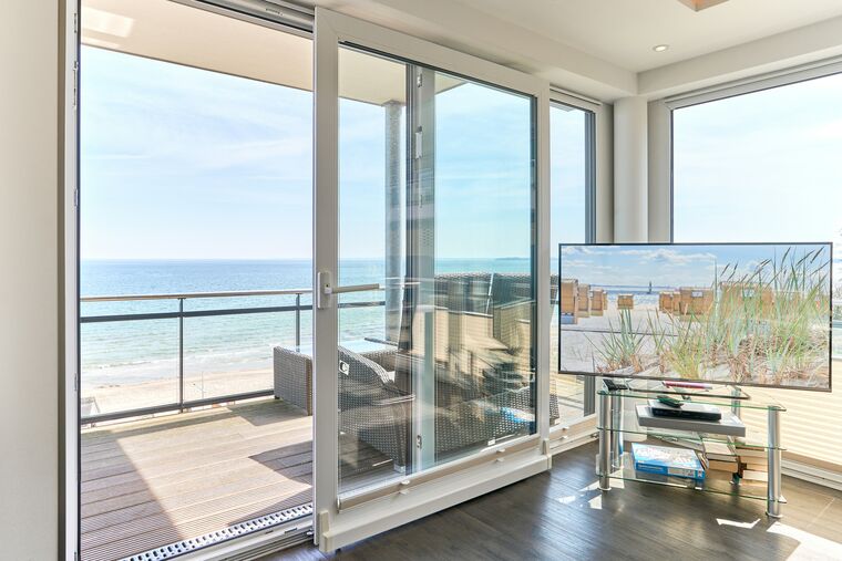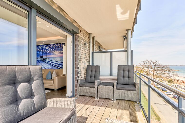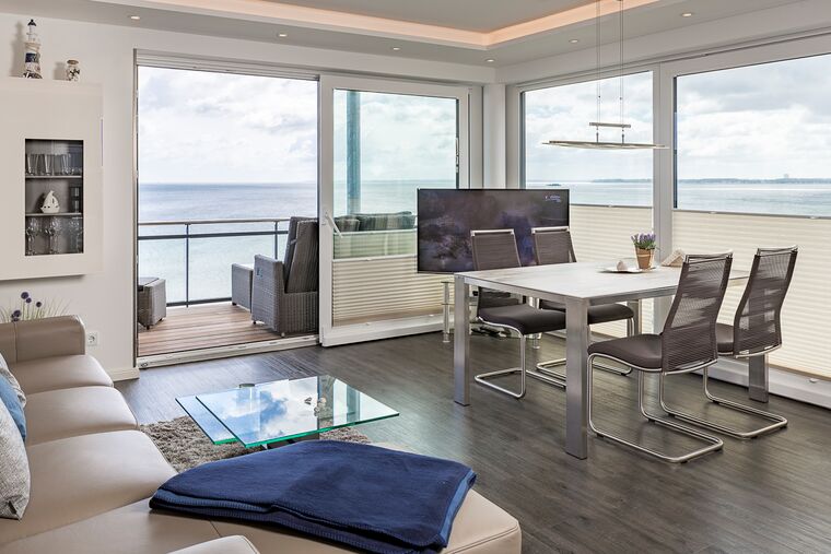 Bereits im Flur können Sie schon auf die Ostsee blicken und weiter … Aus allen Räumen haben Sie Ostseeblick! In dieser traumhaften Wohnung werden Sie sich gleich wohlfühlen. Die Wohnzimmerdecke ist rundum abgesenkt und sorgt mit dem integrierten Licht für eine angenehme Atmosphäre. Das Sofa bietet Ihnen einen besonderen Sitzkomfort, das Canapee ist elektrisch verstellbar. Ihr Heimkinosystem bietet Ihnen Blu-ray, TV in 55 Zoll und ein 3-D-Soundsystem. Der Essbereich hat genügend Platz für vier Personen. Die anspruchsvolle Küche ist mit hochwertigen Elektrogeräten ausgestattet. Geschirrspülmaschine, Induktionsherd, Mikrowelle, Backofen, Wasserkocher, Kaffeemaschine, Pad-Kaffeemaschine und vieles mehr. Der halbumlaufende Balkon ist mit Loungemöbeln ausgestattet – träumen Sie schon?