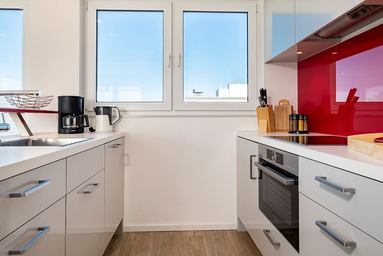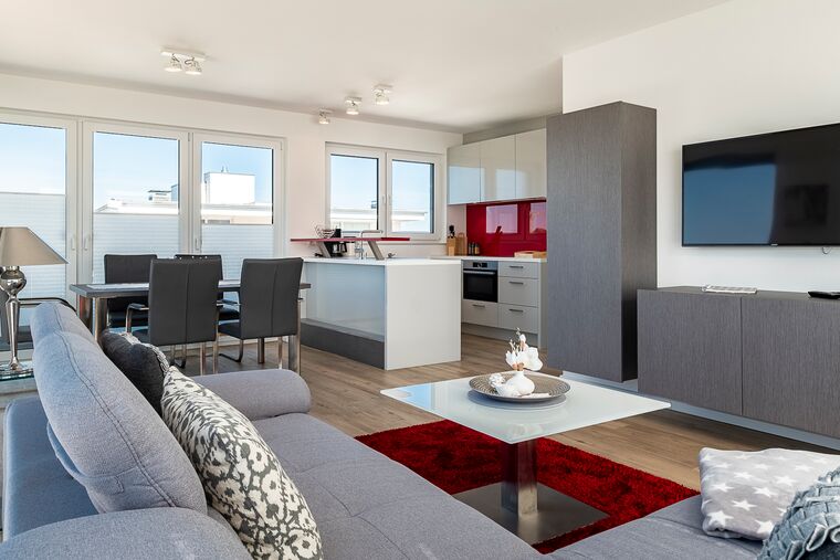 Die bestens ausgestattete Penthouse-Wohnung punktet sicher mit Ihrer Privatsauna für 4 Personen mit Blick über die Ostsee. Die Sauna mit Ostseeblick befindet sich im Dachpavillon, den Sie über eine innenliegende Treppe erreichen. Neben der Sauna ist ein Tageslichtbad mit bodengleicher Dusche, Waschbecken und WC. Der obere Raum ist mit einer Klimaanlage und einem FLACH-TV ausgestattet sowie mit einer zusätzlichen Schlafmöglichkeit. Auf der angeschlossenen 35m² großen Dachterrasse, die einen Ausblick nach Süden, Westen und Norden bietet, haben Sie Sonne bis zum Sonnenuntergang. Vier Liegen mit bequemen Auflagen laden zum Relaxen ein, der Blick von hier oben über die Lübecker Bucht ist fantastisch. Der lichtdurchflutete, großzügige Wohnbereich im unteren Teil der Wohnung hat eine offene Küche, die individuell angefertigt wurde und mit hochwertigen Einbaugeräten ausgestattet ist. Eine schicke Theke trennt die Küche vom Essplatz, der mit einem großen Esstisch und bequemen Stühlen möbliert ist. Sie können es sich auf einem großzügigen Sofa im Wohnbereich gemütlich machen und von dort die neuesten Unterhaltungsmedien nutzen, z. B. HD-/3-D-Flachbildfernseher, Blue Ray und Soundstation sowie kostenloses WLAN.