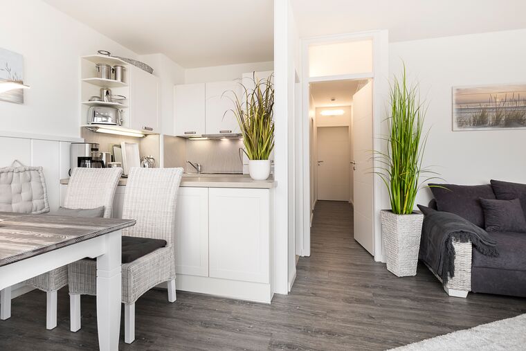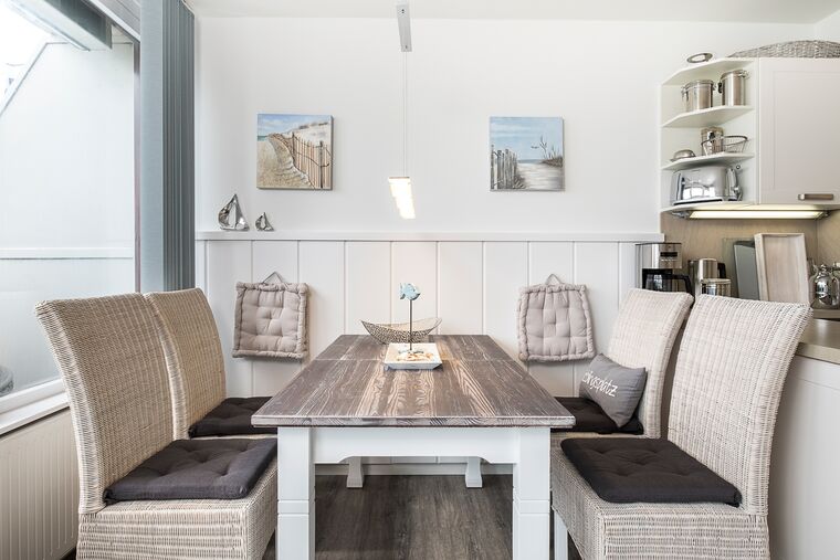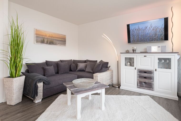 Meerblick, Kaffeemaschine mit Milchaufschäumer, WMF-WOK, Fußbodenheizung, Handtuchheizkörper, Kinderbett, Kinderhochstuhl und Babybadewanne, Fluxtec-Bollerwagen, WLAN, Kfz-Außenstellplatz, Strandkorb gegenüber am Strand (saisonbedingt 15.05. – 15.09.).