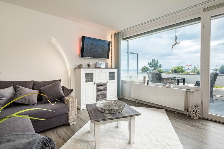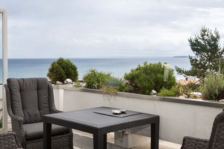 2,5-Zimmer-Ferienwohnung, ca. 56 m², Südbalkon mit herrlichem Ostseeblick, Duschbad, Kfz-Außenstellplatz, für bis zu 3 Personen. Die Wohnung liegt im 1. OG nach Süden. Bis zur Wohnung sind einige kleine Treppenstufen zu gehen.