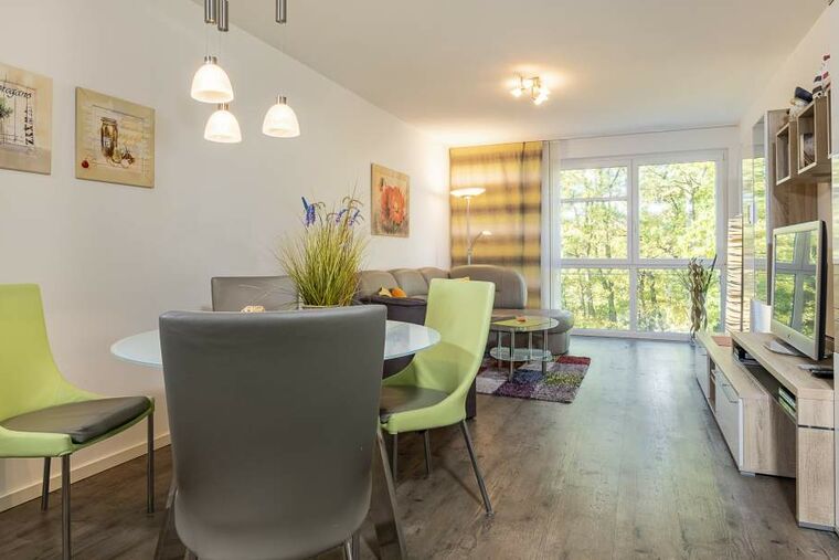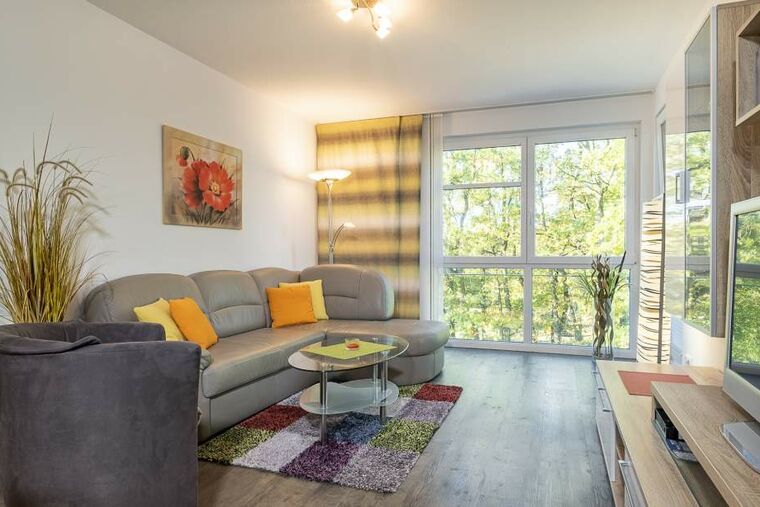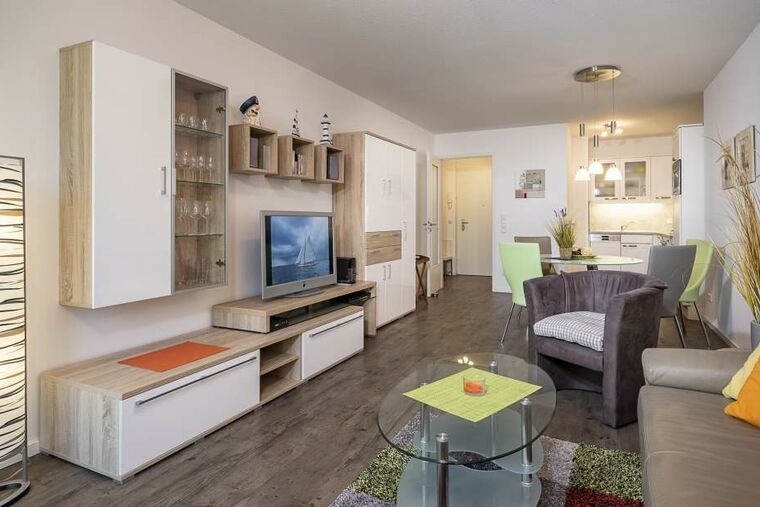 Der helle Wohnbereich mit bodentiefen Fenstern bietet einen Essplatz für 4 Personen, ein gemütliches Sofa, das sich mit wenigen Handgriffen in eine Schlafcouch (1,70 x 2,00m) verwandeln lässt, einen Flachbild-TV, WLAN, eine iPod-Dockingstation, einen Blue-Ray-Player, eine Stereoanlage und einen Safe. Die voll ausgestattete Küche lässt keine Wünsche offen. Vom Balkon aus hat man einen seitlichen Blick aufs Meer und die Aussicht in den Kurpark. Ein komfortables Doppelbett (1,80 m x 2,00 m) sorgt im Schlafzimmer für eine erholsame Nachtruhe. Hier finden Sie den zweiten Flachbild-TV. Im Badezimmer mit bodengleicher Dusche ist auch die Waschmaschine untergebracht. Die Wohnung liegt direkt gegenüber dem Kurpark, nur wenige Schritte von der Fußgängerzone und der Ostsee entfernt. Sie verfügt über einen Safe und einen abschließbaren Fahrradkeller.