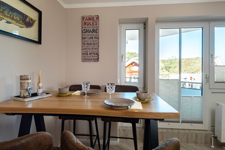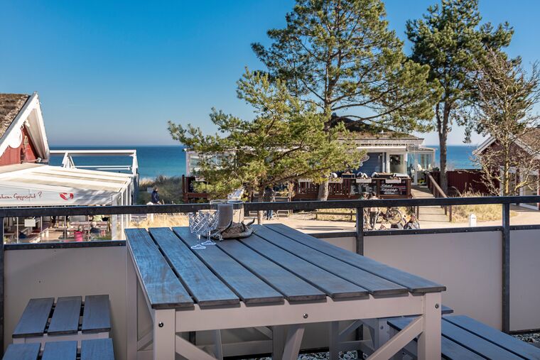 Der Wohn-Essbereich ist mit einer bequemen Couch (welche schnell in ein komfortables Schlafsofa umgebaut werden kann), einem Sessel sowie Beistelltischchen eingerichtet. Neben dem Flachbildfernseher steht Ihnen selbstverständlich kostenloses WLAN zur Verfügung. Die helle Küche mit angrenzendem Esstisch ist komplett ausgestattet. Schöne überdachte Loggia mit Morgensonne und Blick auf die Ostsee. Hier stehen Ihnen Tisch und Stühle zur Verfügung. Das Schlafzimmer ist mit einem Doppelbett (1,60 x 2,00m) und einem geräumigen Kleiderschrank sowie einem Flachbildfernseher ausgestattet. Auch von hier aus haben Sie einen Ostseeblick und Zugang zur Loggia. Das Badezimmer verfügt über eine bodentiefe Dusche und einen Handtuchheizkörper. Eine sehr angenehme Lösung in dieser Wohnung ist das separate WC.