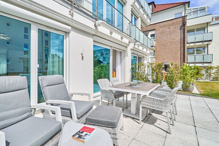 2-Zimmer-Ferienwohnung, ca. 48 m² zzgl. Terrasse in der Hansa-Straße 11. Diese sehr schöne, neue 2-Zimmerwohnung liegt im Erdgeschoss, Sonnenterrasse mit elektrischer Markise, bodentiefe Fenster, Außenrollläden, kostenfreies WLAN, Tiefgaragenstellplatz (Durchfahrthöhe 2,00 m).