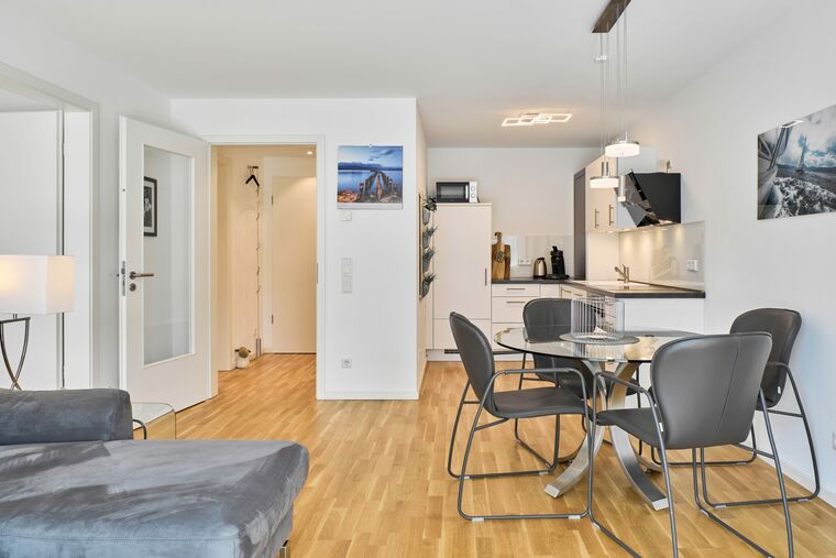Die Ferienwohnung strahlt mit ihren bodentiefen Fenstern eine helle, behagliche Gemütlichkeit aus. Im Flurbereich befinden sich ein Einbauschrank und ein Ganzkörperspiegel. Die Einbauküche im Wohn-Essbereich ist komplett ausgestattet und lässt keine Wünsche offen; Küchenzeile mit Backofen, Ceran-Kochfeld, Elektroherd, Dunstabzug, Geschirr, Geschirrspüler, Kühlschrank incl. Gefrierfach, Mikrowelle, Filterkaffeemaschine, Pad-Kaffeemaschine, Toaster, Wasserkocher. Der Wohnbereich ist mit einem bequemen Sofa, einem Wohnzimmertisch, einem großen TV sowie einem Essbereich ausgestattet. Aus dem Wohnbereich gelangen Sie auf die herrliche Sonnenterrasse. Hier stehen Ihnen zwei verstellbare Liegen zur Verfügung.