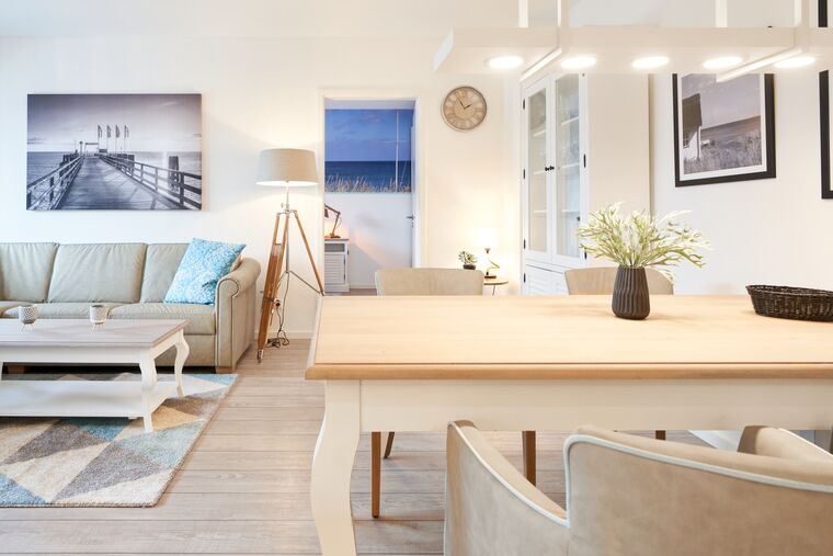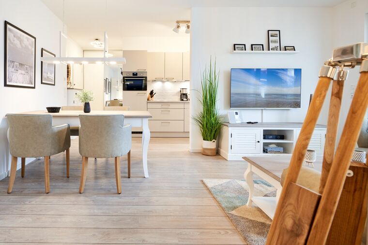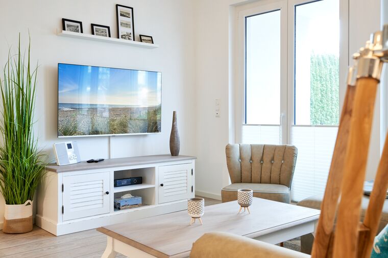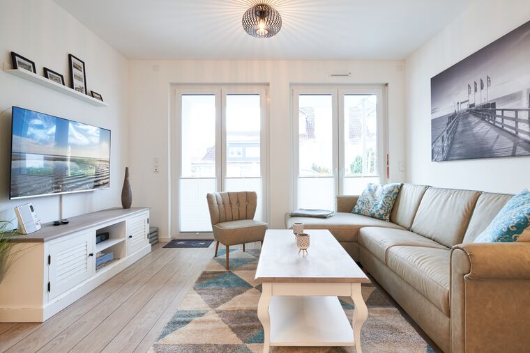 Die 3-Zimmer-Ferienwohnung ist mit bodentiefen Fenstern ausgestattet. An allen Fenstern befinden sich Licht- und Sichtschutz sowie Außenrollläden. Die Einbauküche im Wohn-Essbereich ist komplett ausgestattet. Backofen, Ceran-Kochfeld, Mikrowelle, Geschirrspüler, Kühlschrank mit Gefrierfach, Filterkaffeemaschine, Tassimo Kapselmaschinen, Eierkocher, Mixer, Toaster und Wasserkocher. Der Wohnbereich ist mit einem hochwertigen Sofa, einem Wohnzimmertisch, einem TV (55 Zoll) sowie einem Essbereich ausgestattet. Aus dem Wohnbereich gelangen Sie auf den überdachten Westbalkon. Hier stehen Ihnen Tisch und Stühle zur Verfügung. Das 1. Schlafzimmer ist mit einem Boxspringbett ( 2,00m x 2,00m), einem großen Kleiderschrank, 2 Nachttischen sowie einem Wand-TV (43 Zoll) ausgestattet. Das 2. Schlafzimmer hat zwei Einzel-Boxspringbetten (0,90m x 2,00m), 2 Nachttische, einen Kleiderschrank sowie einen Wand-TV (43 Zoll). Alle Fenster haben elektrische Außenrollläden. Das Duschbad in heller Optik mit bodengleicher Dusche / Regendusche, mit separater Handbrause, Handtuchheizkörper, Fön, Kosmetikspiegel. Die gesamte Wohnung ist mit einer Fußbodenheizung ausgestattet.