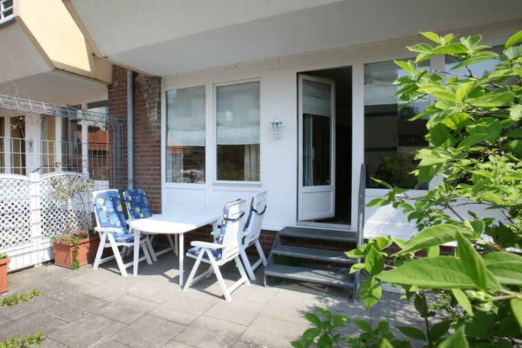 Eine große, nach Westen ausgerichtete Terrasse lädt zum Verweilen und Entspannen im Freien ein. Hier können Sie die Urlaubstage herrlich mit einem Frühstück beginnen sowie auch mit ein paar Snacks und Getränken am Abend ausklingen lassen.