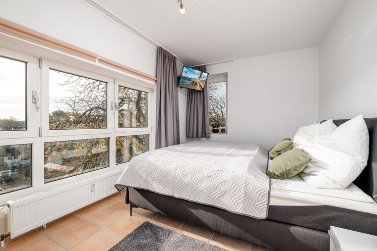 Das gemütliche Schlafzimmer ist mit Verdunklungsgardinen, Boxspringbett (2 x 90 cm x 200 cm) und einem weiteren Kabel-TV ausgestattet. Im Appartement steht auch ein kostenloser Zugang zum digitalen Lesezirkel zur Nutzung bereit.