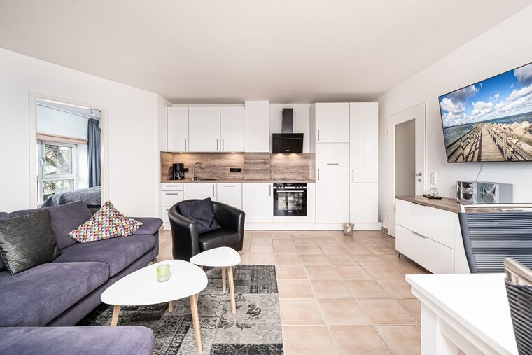 Das große Wohnzimmer ist mit einer Schlafcouch, Kabel-TV und einer HiFi-Anlage eingerichtet. Hier befindet sich auch die funktionale, integrierte Küche mit Geschirrspüler, Kühl-Gefrierkombination, Mikrowelle und Nespresso- sowie Filterkaffeemaschine.