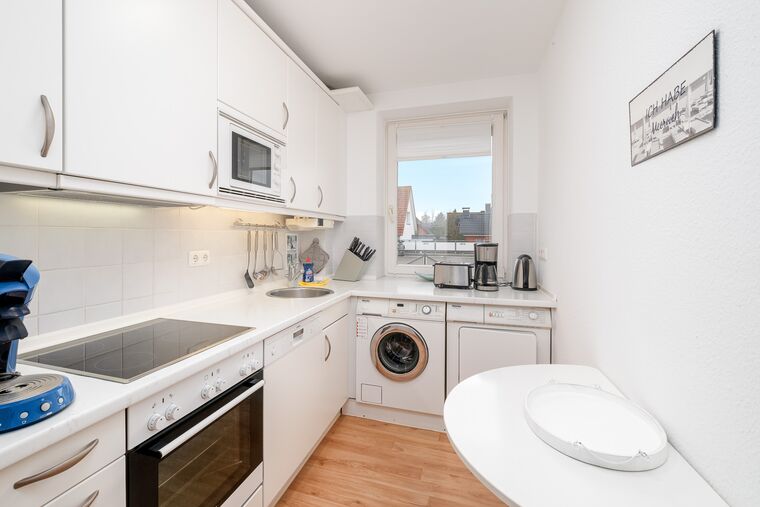 Die separate Einbauküche ist mit einem Geschirrspüler, Mikrowelle und Filter- und Kapselkaffeemaschine (Nespresso) sowie einer Waschmaschine und Trockner sehr gut ausgestattet. Im hellen und komfortablen Duschbad befindet sich ebenfalls ein Fön.
