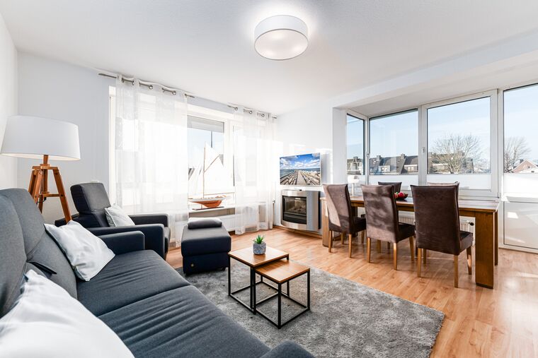 In der modern eingerichteten 3 Zimmer Ferienwohnung ist das helle Wohnzimmer mit einer Essecke, Kabel-TV mit Blu-Ray / DVD Player, Radio, einem Elektrokamin und einer Schlafcouch ausgestattet. Ein Schlafzimmer mit Doppelbett und ein Schlafzimmer mit Einzelbett bieten weitere Schlafplätze. Ein Kinderreisebett und ein Hochstuhl steht ebenfalls kostenlos in dem Appartement zur Verfügung.