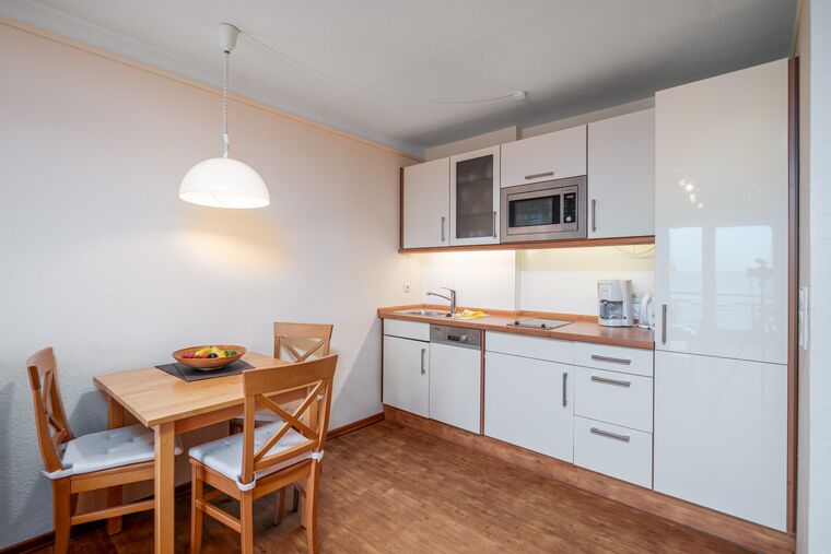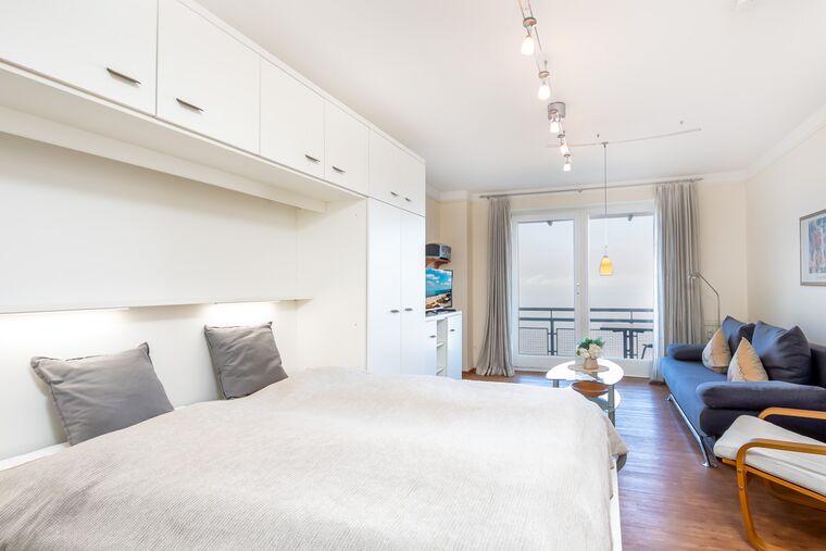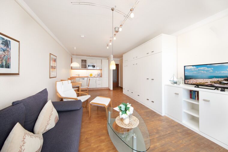 Der gemütliche Wohnschlafraum ist mit einem Sofa, einer Essecke und einer integrierten Einbauküche eingerichtet. In der Einbauküche finden Sie neben dem Geschirrspüler und der Mikrowelle alles Nötige zum Kochen. Hier steht Ihnen ein Kabel-TV, DVD-Player und eine HiFi-Anlage zur Verfügung.