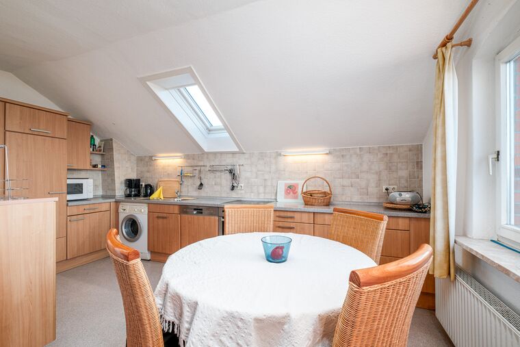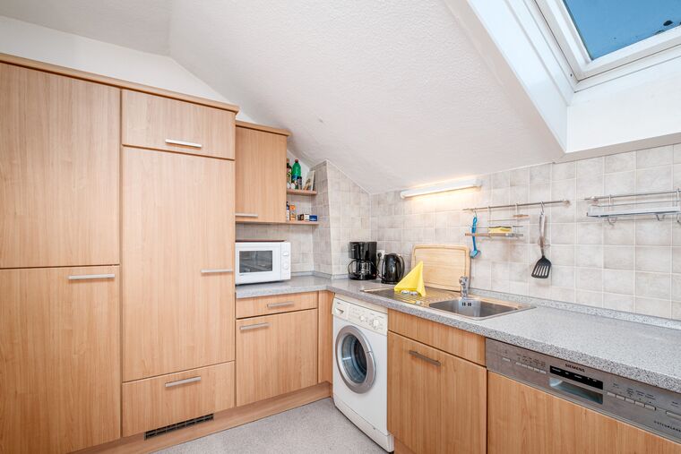 Die voll ausgestattete Einbauküche mit Geschirrspüler und Mikrowelle ist mit dem Wohnzimmer verbunden und auch eine Waschmaschine ist hier für Sie nutzbar. In der gemütlichen Essecke findet die ganze Familie Platz.