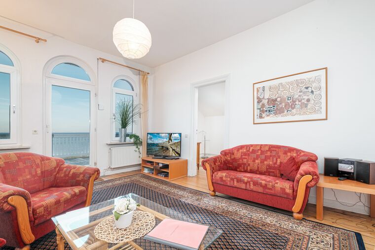 Das geräumige Wohnzimmer hat einen herrlichen Meerblick auf die Lübecker Bucht! Ein SAT-TV mit DVD-Player und ein Radio sind auch im Wohnzimmer vorhanden.