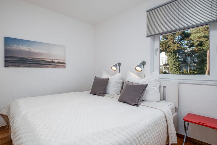 Das lichtdurchflutete, helle Schlafzimmer verfügt über ein bequemes Doppelbett (2 x 90 cm x 200 cm) und einen großen Kleiderschrank, der viel Platz für die mitgebrachte Urlaubskleidung bereithält.