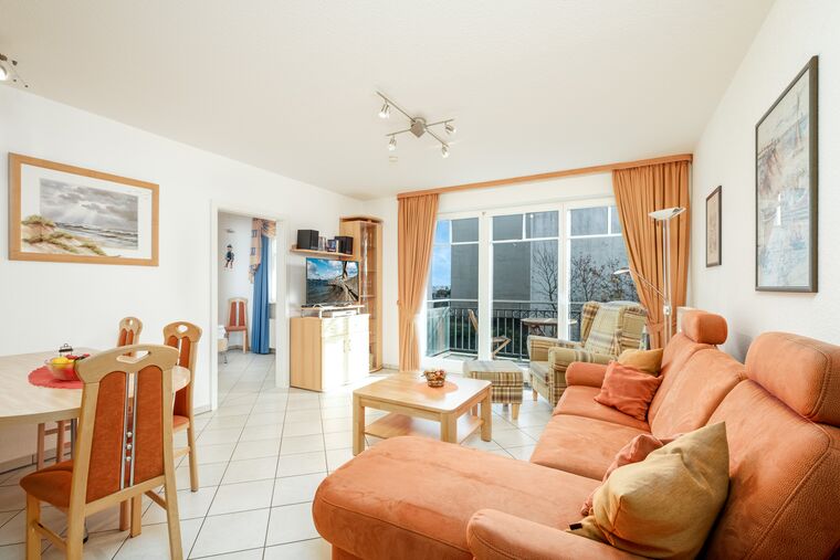 Das Wohnzimmer ist mit einer gemütlichen Schlafcouch sowie Kabel-TV mit DVD-Player und HiFi-Anlage ausgestattet. Von hier aus haben Sie Zugang zum Balkon, um die frische Meeresluft und den seitlichen Meerblick zu genießen.
