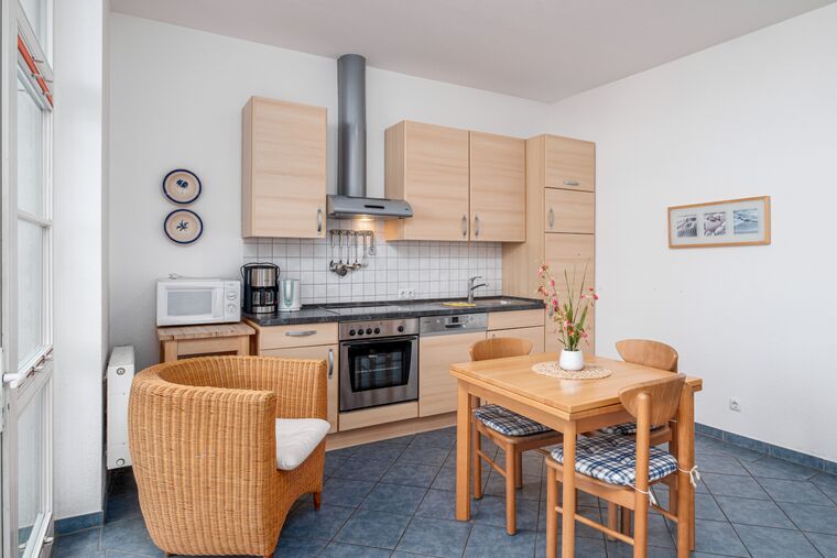 In dem großen Wohnraum befindet sich eine gemütliche Schlafcouch, ein Sat-TV mit Blu-ray Disc/DVD-Player und eine HiFi-Anlage. Die moderne, integrierte Einbauküche ist mit einem Geschirrspüler und Mikrowelle sowie einer schönen geräumigen Essecke eingerichtet.