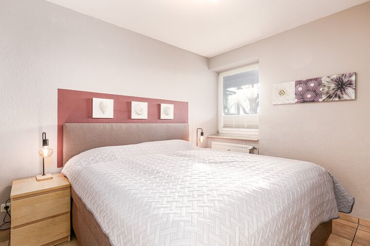 Das separate Schlafzimmer mit gemütlichem Doppelbett (2 x 90 cm x 200 cm) bietet mit dem großen Kleiderschrank viel Raum für die mitgebrachte Urlaubskleidung.