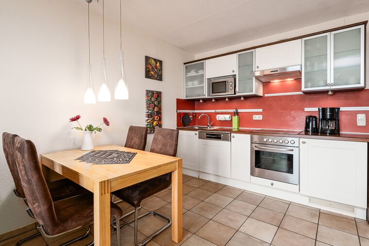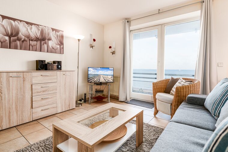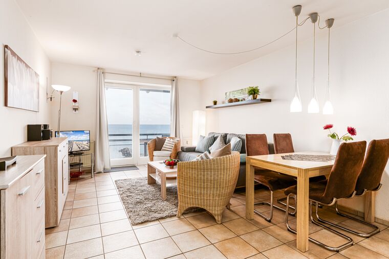 Das Wohnzimmer teilt sich in einen Essbereich mit integrierter Einbauküche, Geschirrspüler und Mikrowelle sowie einem komfortablen Sitzbereich mit Schlafcouch (140 cm x 200 cm), Kabel-TV mit DVD-Player und HiFi-Anlage auf. Für ausgelassene Spieleabende oder auch ruhige Lesesession's ist viel Platz vorhanden und dauerhaft von dem traumhaften Meerblick begleitet.