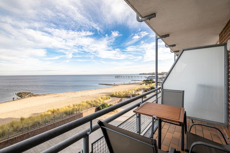 In der geschmackvoll eingerichteten, 48m² großen 2-Zimmer Niendorf Ferienwohnung im 2. OG genießen bis zu 3 Personen vom Wohnraum und dem dazugehörigen Balkon aus einen einmaligen direkten Meerblick auf die Lübecker Bucht der Ostsee.