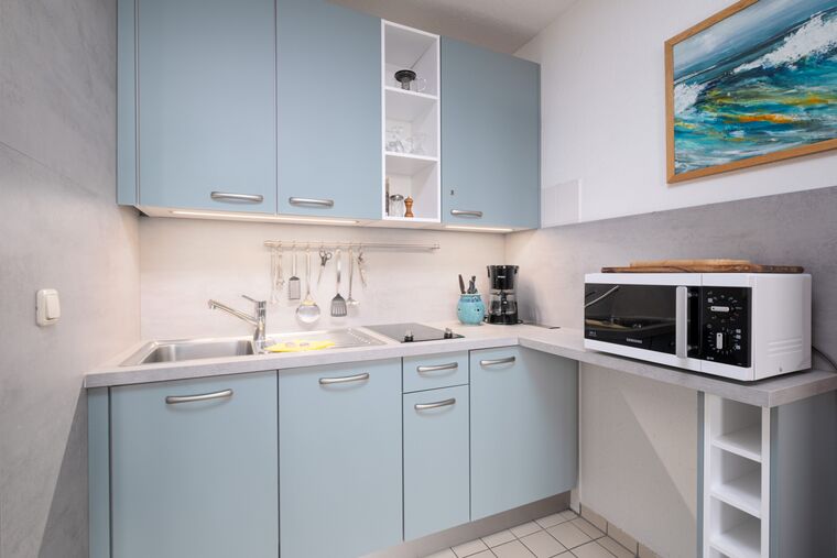 Das schöne Appartement Nr. 3 ist 30m² groß und für bis zu 2 Personen eingerichtet. Es befindet sich im Erdgeschoss und hat vom Balkon aus einen hervorragenden Meerblick. Die Ferienwohnung ist ganz praktisch eingerichtet - alles ist im Wohnzimmer vorhanden.