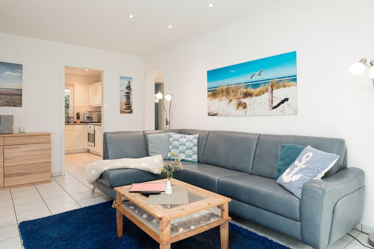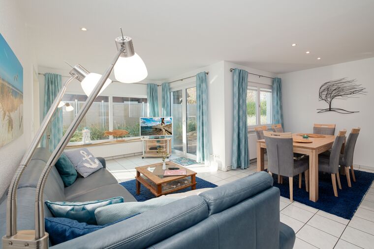 Der große, helle Wohnraum ist mit Kabel-TV, DVD-Player, HiFi-Anlage und Essecke ausgestattet.