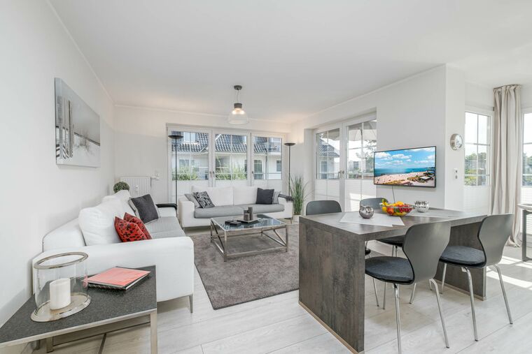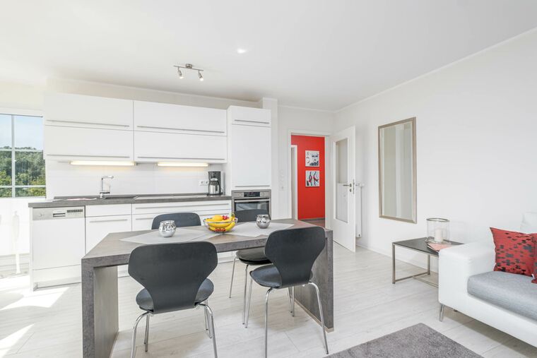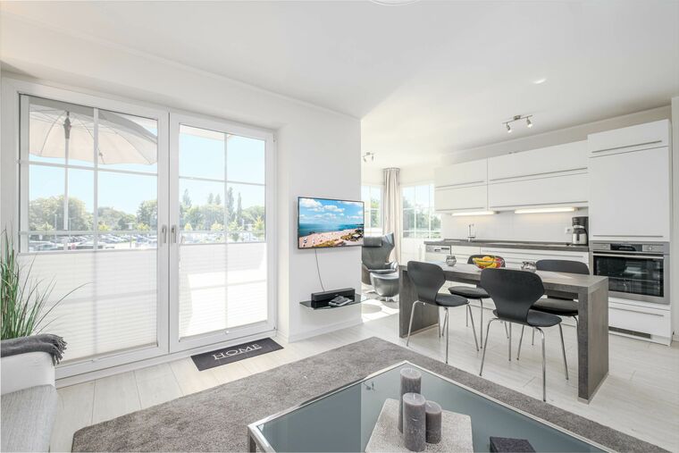 Der Wohnraum ist luxuriös mit einer komfortablen Couchgarnitur, Kabel-TV sowie einer Bluetooth-Soundbar eingerichtet. Über den Essbereich gelangen Sie zu der integrierten Einbauküche, die über einen Geschirrspüler, Backofen, ein Induktionskochfeld sowie eine Kaffee- und Nespressomaschine verfügt.