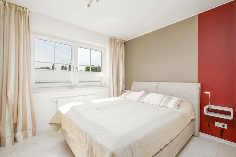Ein bequemes Doppelboxspringbett (1 x 160 cm x 200 cm) sowie einen großen hellen Kleiderschrank, der viel Platz für die Urlaubskleidung bietet, finden Sie im separaten Schlafzimmer vor.